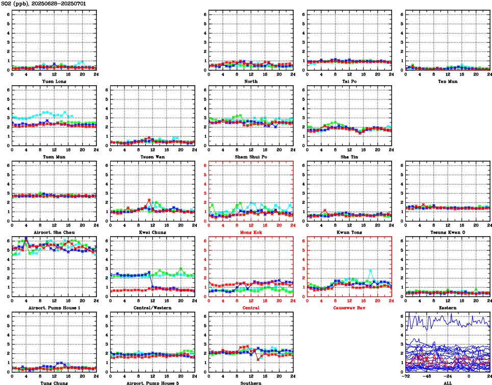 | Air Quality Data Time Series for SO2 (2025/07/01) | ( Line colors: Day -3 Day -2 Day -1 Current day ) | 2D Map Current AQHI |