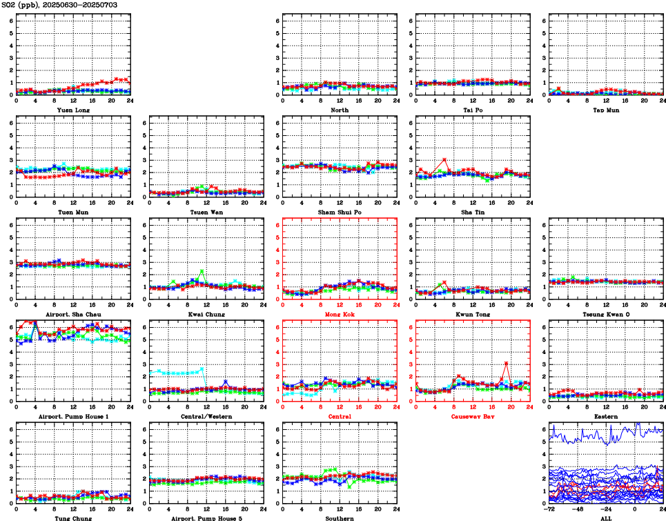 | Air Quality Data Time Series for SO2 (2025/07/03) | ( Line colors: Day -3 Day -2 Day -1 Current day ) | 2D Map Current AQHI |