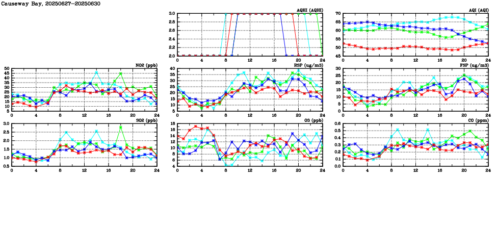 | Air Quality Data Time Series in Causeway Bay (2025/06/30) | ( Line colors: Day -3 Day -2 Day -1 Current day ) | 2D Map Current AQHI |