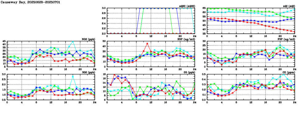 | Air Quality Data Time Series in Causeway Bay (2025/07/01) | ( Line colors: Day -3 Day -2 Day -1 Current day ) | 2D Map Current AQHI |