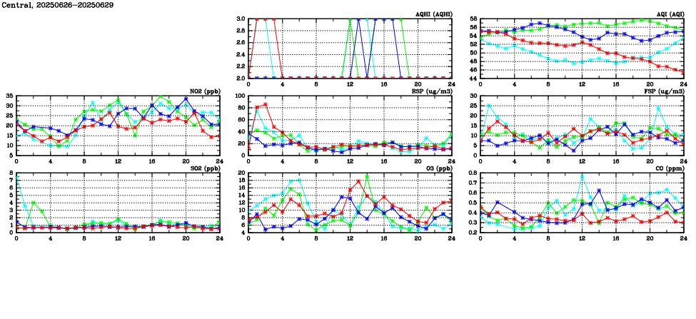 | Air Quality Data Time Series in Central (2025/06/29) | ( Line colors: Day -3 Day -2 Day -1 Current day ) | 2D Map Current AQHI |
