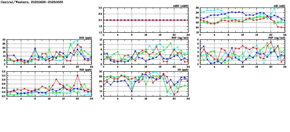 | Air Quality Data Time Series in Central/Western (2025/06/29) | ( Line colors: Day -3 Day -2 Day -1 Current day ) | 2D Map Current AQHI |