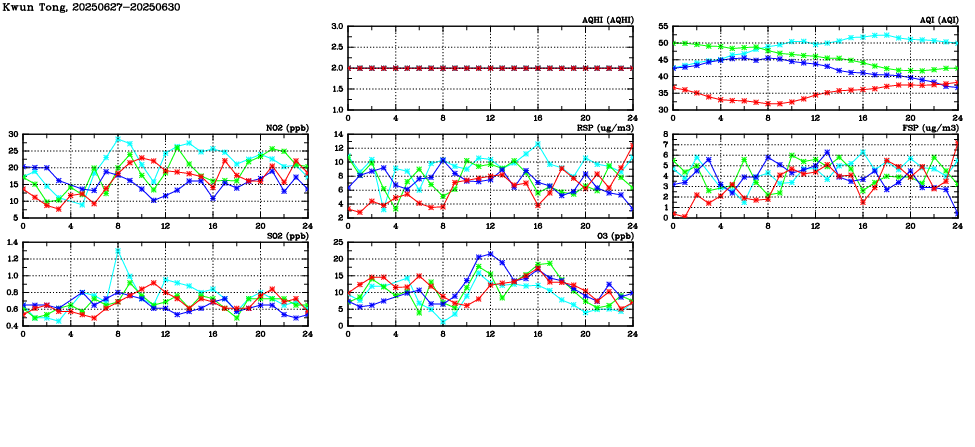 | Air Quality Data Time Series in Kwun Tong (2025/06/30) | ( Line colors: Day -3 Day -2 Day -1 Current day ) | 2D Map Current AQHI |