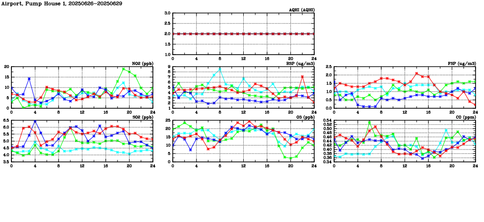 | Air Quality Data Time Series in Airport, Pump House 1 (2025/06/29) | ( Line colors: Day -3 Day -2 Day -1 Current day ) | 2D Map Current AQHI |