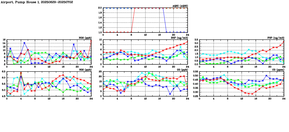 | Air Quality Data Time Series in Airport, Pump House 1 (2025/07/02) | ( Line colors: Day -3 Day -2 Day -1 Current day ) | 2D Map Current AQHI |