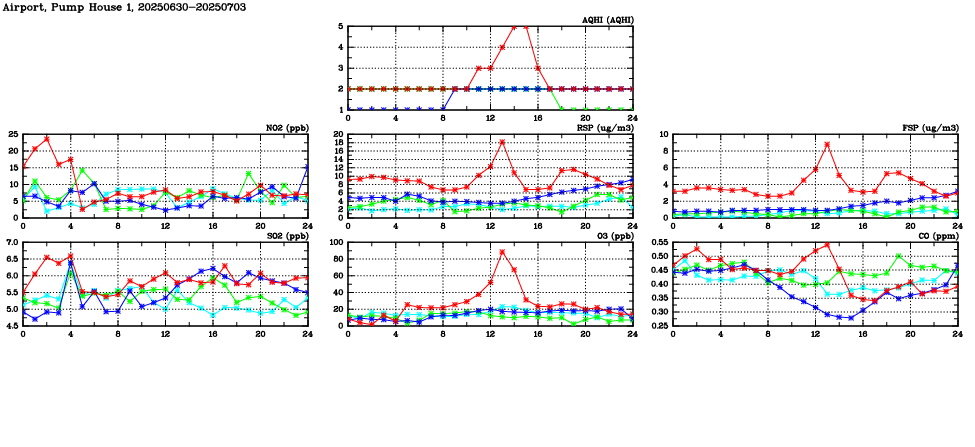 | Air Quality Data Time Series in Airport, Pump House 1 (2025/07/03) | ( Line colors: Day -3 Day -2 Day -1 Current day ) | 2D Map Current AQHI |