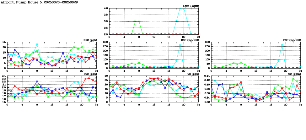 | Air Quality Data Time Series in Airport, Pump House 5 (2025/06/29) | ( Line colors: Day -3 Day -2 Day -1 Current day ) | 2D Map Current AQHI |