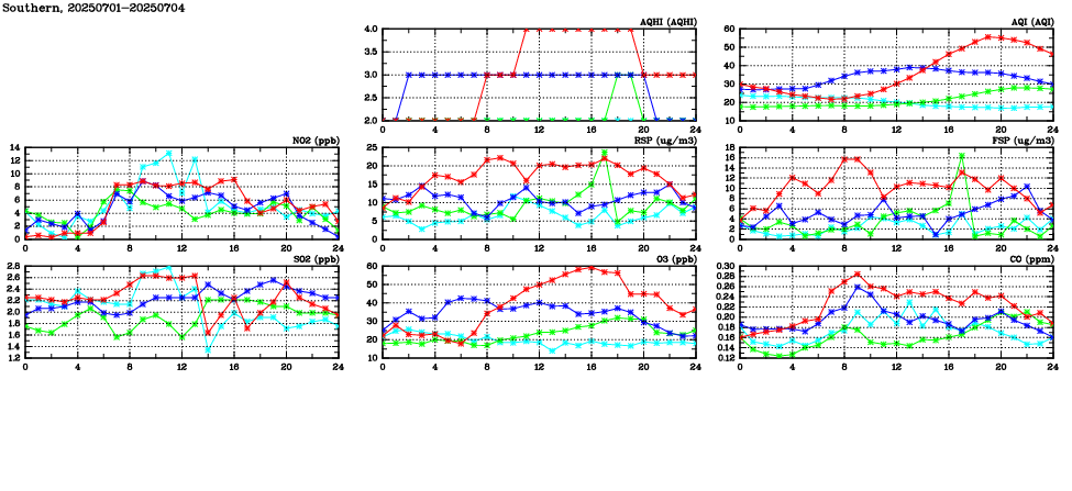 | Air Quality Data Time Series in Southern (2025/07/04) | ( Line colors: Day -3 Day -2 Day -1 Current day ) | 2D Map Current AQHI |