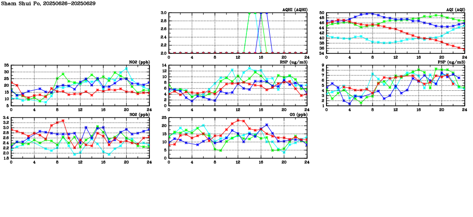 | Air Quality Data Time Series in Sham Shui Po (2025/06/29) | ( Line colors: Day -3 Day -2 Day -1 Current day ) | 2D Map Current AQHI |