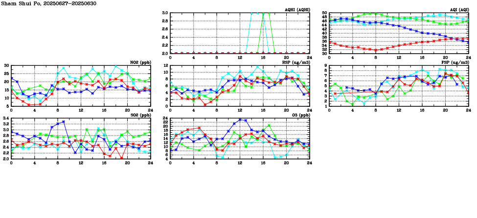 | Air Quality Data Time Series in Sham Shui Po (2025/06/30) | ( Line colors: Day -3 Day -2 Day -1 Current day ) | 2D Map Current AQHI |