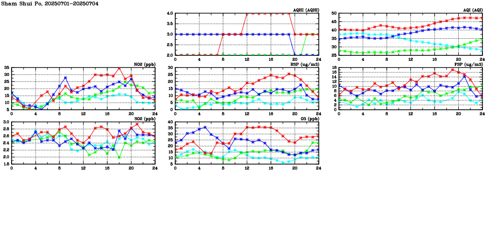 | Air Quality Data Time Series in Sham Shui Po (2025/07/04) | ( Line colors: Day -3 Day -2 Day -1 Current day ) | 2D Map Current AQHI |
