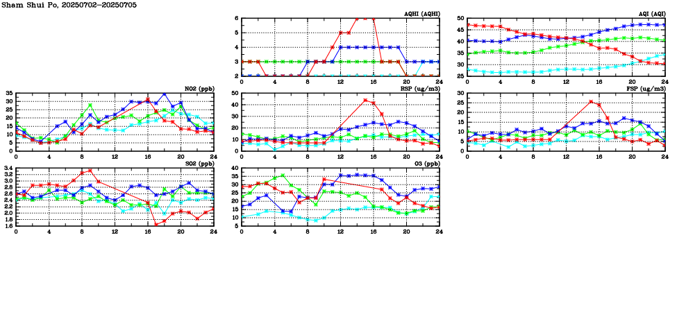 | Air Quality Data Time Series in Sham Shui Po (2025/07/05) | ( Line colors: Day -3 Day -2 Day -1 Current day ) | 2D Map Current AQHI |