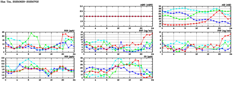 | Air Quality Data Time Series in Sha Tin (2025/07/02) | ( Line colors: Day -3 Day -2 Day -1 Current day ) | 2D Map Current AQHI |