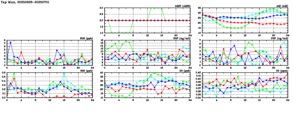| Air Quality Data Time Series in Tap Mun (2025/07/01) | ( Line colors: Day -3 Day -2 Day -1 Current day ) | 2D Map Current AQHI |