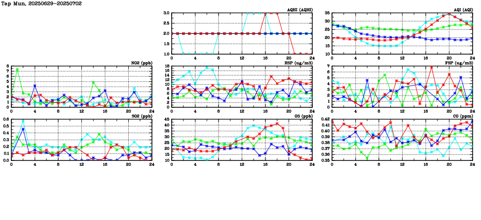 | Air Quality Data Time Series in Tap Mun (2025/07/02) | ( Line colors: Day -3 Day -2 Day -1 Current day ) | 2D Map Current AQHI |