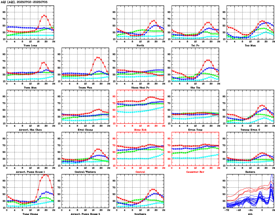 | Air Quality Data Time Series for AQI (2025/07/05) | ( Line colors: Day -3 Day -2 Day -1 Current day ) | 2D Map Current AQHI |