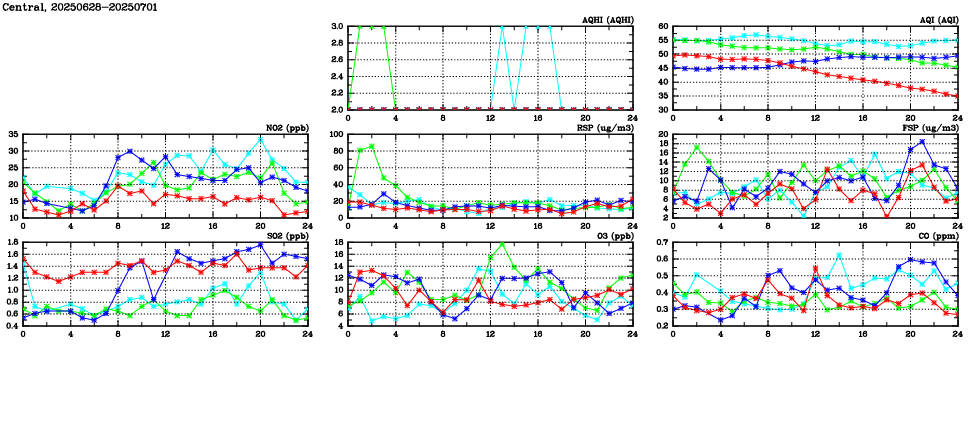 | Air Quality Data Time Series in Central (2025/07/01) | ( Line colors: Day -3 Day -2 Day -1 Current day ) | 2D Map Current AQHI |