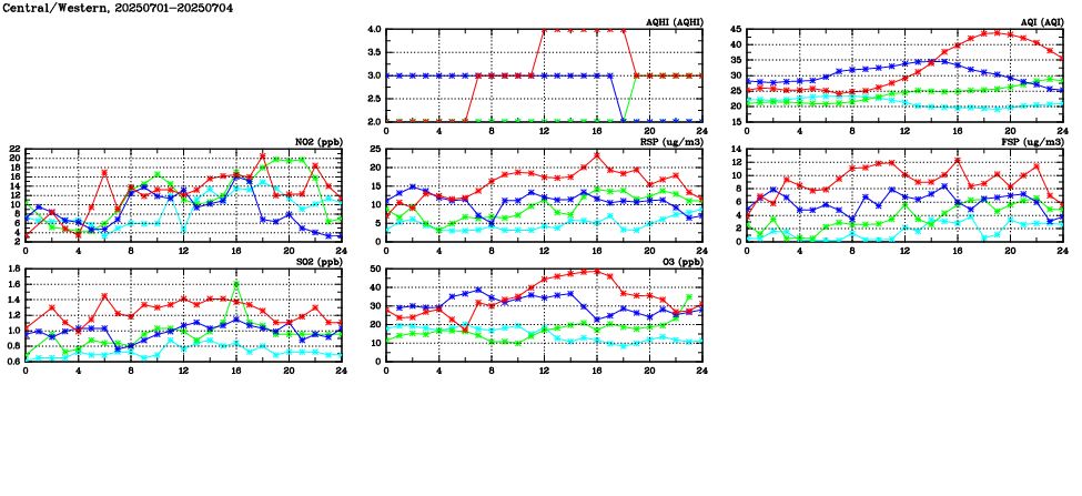 | Air Quality Data Time Series in Central/Western (2025/07/04) | ( Line colors: Day -3 Day -2 Day -1 Current day ) | 2D Map Current AQHI |