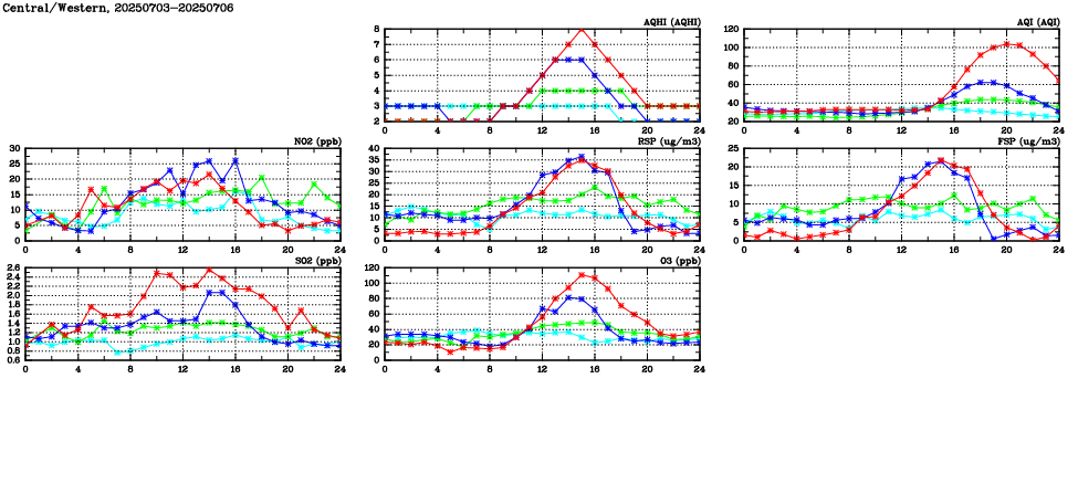 | Air Quality Data Time Series in Central/Western (2025/07/06) | ( Line colors: Day -3 Day -2 Day -1 Current day ) | 2D Map Current AQHI |