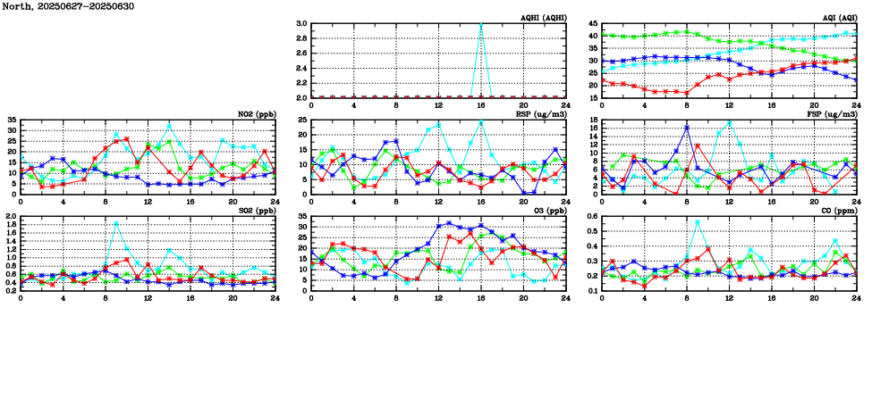 | Air Quality Data Time Series in North (2025/06/30) | ( Line colors: Day -3 Day -2 Day -1 Current day ) | 2D Map Current AQHI |