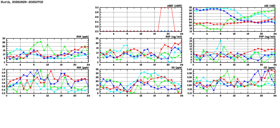 | Air Quality Data Time Series in North (2025/07/02) | ( Line colors: Day -3 Day -2 Day -1 Current day ) | 2D Map Current AQHI |