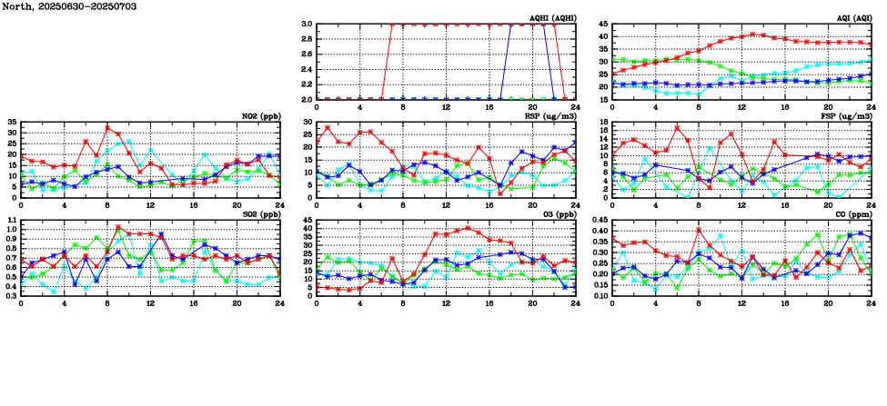 | Air Quality Data Time Series in North (2025/07/03) | ( Line colors: Day -3 Day -2 Day -1 Current day ) | 2D Map Current AQHI |