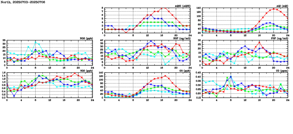 | Air Quality Data Time Series in North (2025/07/06) | ( Line colors: Day -3 Day -2 Day -1 Current day ) | 2D Map Current AQHI |