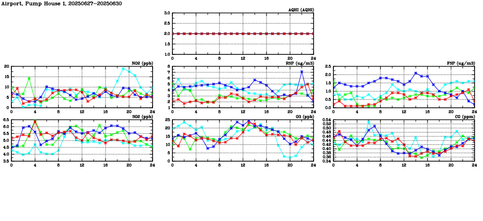 | Air Quality Data Time Series in Airport, Pump House 1 (2025/06/30) | ( Line colors: Day -3 Day -2 Day -1 Current day ) | 2D Map Current AQHI |