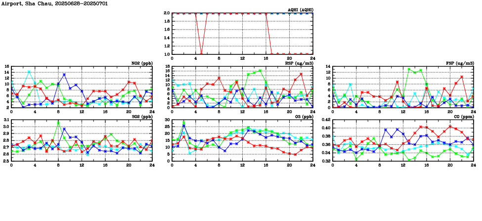| Air Quality Data Time Series in Airport, Sha Chau (2025/07/01) | ( Line colors: Day -3 Day -2 Day -1 Current day ) | 2D Map Current AQHI |