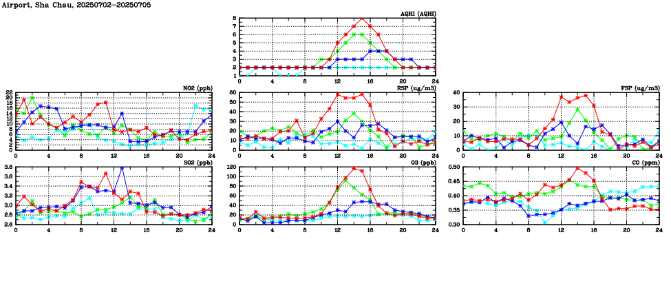 | Air Quality Data Time Series in Airport, Sha Chau (2025/07/05) | ( Line colors: Day -3 Day -2 Day -1 Current day ) | 2D Map Current AQHI |