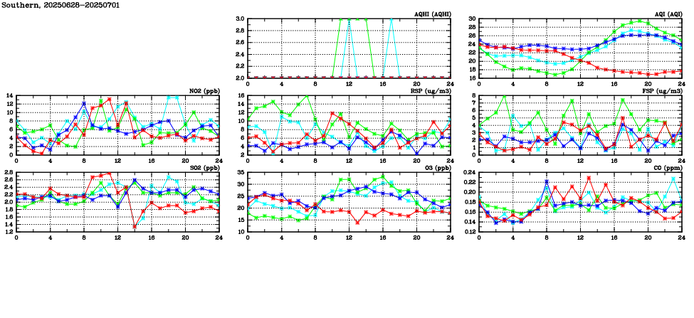 | Air Quality Data Time Series in Southern (2025/07/01) | ( Line colors: Day -3 Day -2 Day -1 Current day ) | 2D Map Current AQHI |