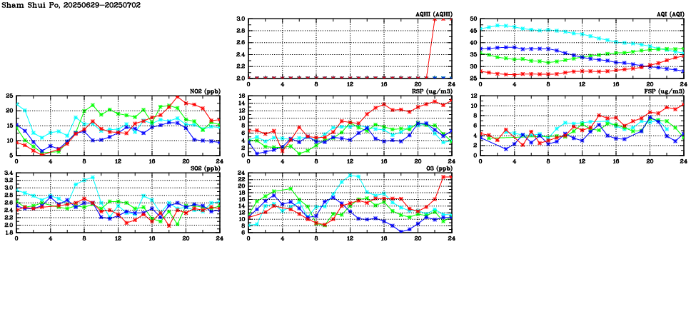 | Air Quality Data Time Series in Sham Shui Po (2025/07/02) | ( Line colors: Day -3 Day -2 Day -1 Current day ) | 2D Map Current AQHI |
