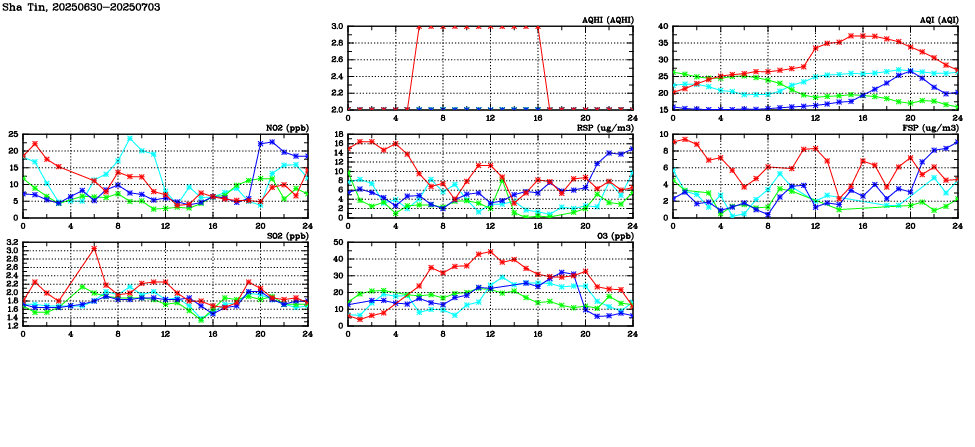 | Air Quality Data Time Series in Sha Tin (2025/07/03) | ( Line colors: Day -3 Day -2 Day -1 Current day ) | 2D Map Current AQHI |