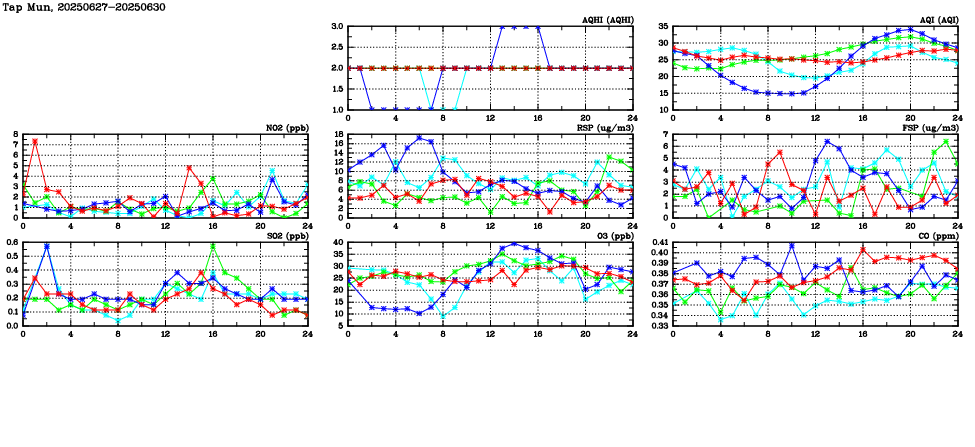 | Air Quality Data Time Series in Tap Mun (2025/06/30) | ( Line colors: Day -3 Day -2 Day -1 Current day ) | 2D Map Current AQHI |