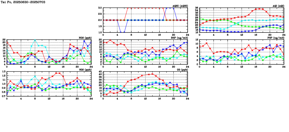 | Air Quality Data Time Series in Tai Po (2025/07/03) | ( Line colors: Day -3 Day -2 Day -1 Current day ) | 2D Map Current AQHI |