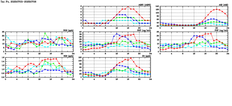 | Air Quality Data Time Series in Tai Po (2025/07/06) | ( Line colors: Day -3 Day -2 Day -1 Current day ) | 2D Map Current AQHI |