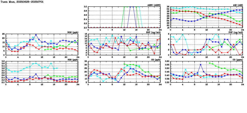 | Air Quality Data Time Series in Tuen Mun (2025/07/01) | ( Line colors: Day -3 Day -2 Day -1 Current day ) | 2D Map Current AQHI |