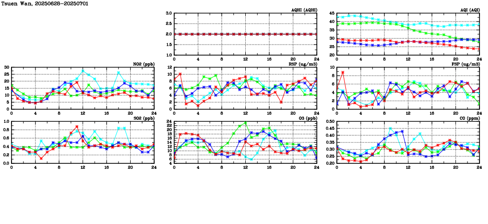| Air Quality Data Time Series in Tsuen Wan (2025/07/01) | ( Line colors: Day -3 Day -2 Day -1 Current day ) | 2D Map Current AQHI |