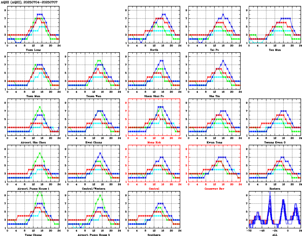 | Air Quality Data Time Series for AQHI (2025/07/07) | ( Line colors: Day -3 Day -2 Day -1 Current day ) | 2D Map Current AQHI |