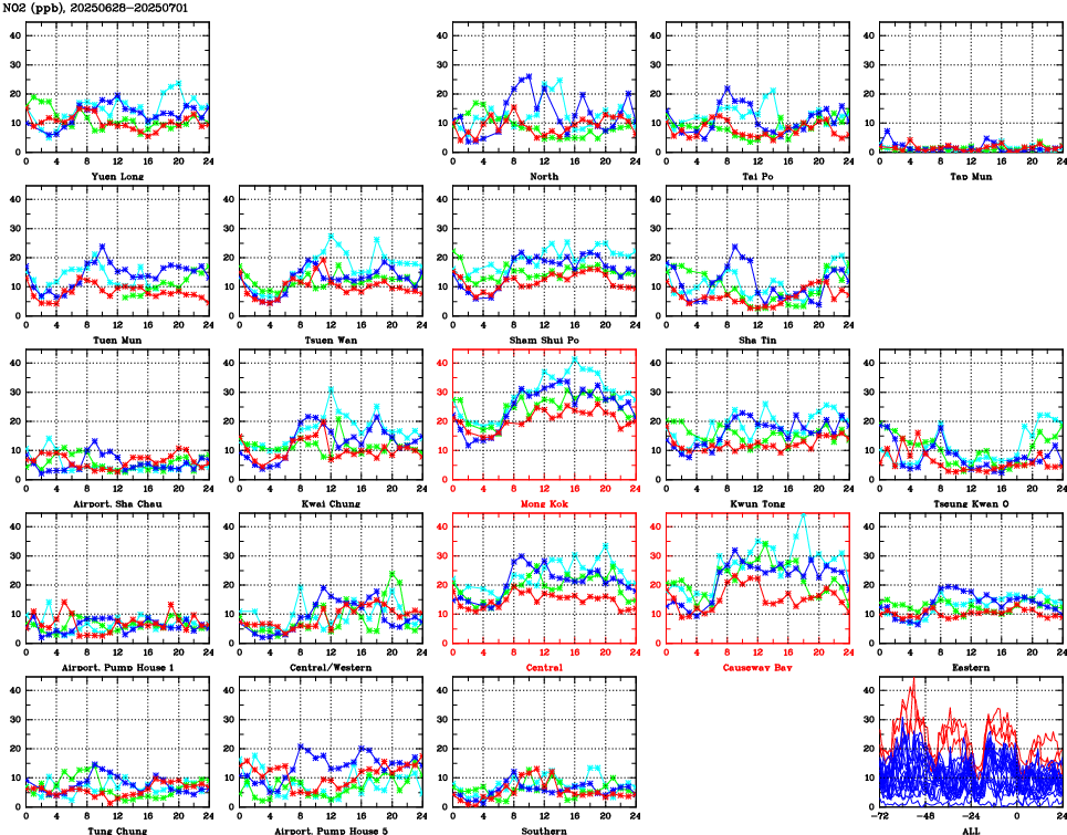 | Air Quality Data Time Series for NO2 (2025/07/01) | ( Line colors: Day -3 Day -2 Day -1 Current day ) | 2D Map Current AQHI |