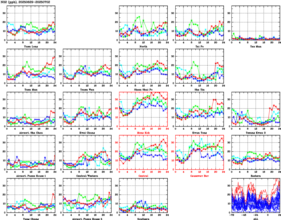 | Air Quality Data Time Series for NO2 (2025/07/02) | ( Line colors: Day -3 Day -2 Day -1 Current day ) | 2D Map Current AQHI |
