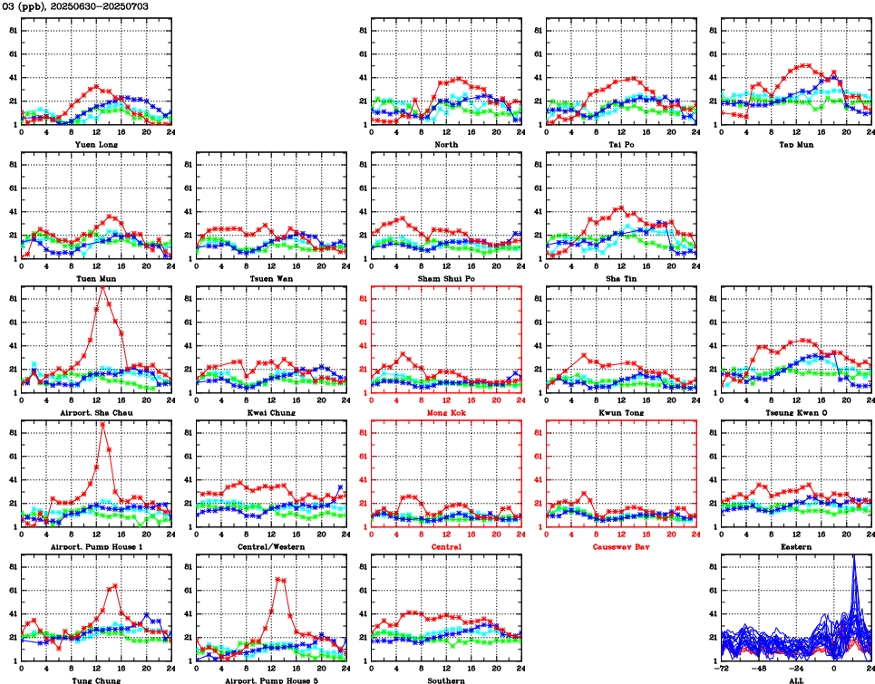 | Air Quality Data Time Series for O3 (2025/07/03) | ( Line colors: Day -3 Day -2 Day -1 Current day ) | 2D Map Current AQHI |