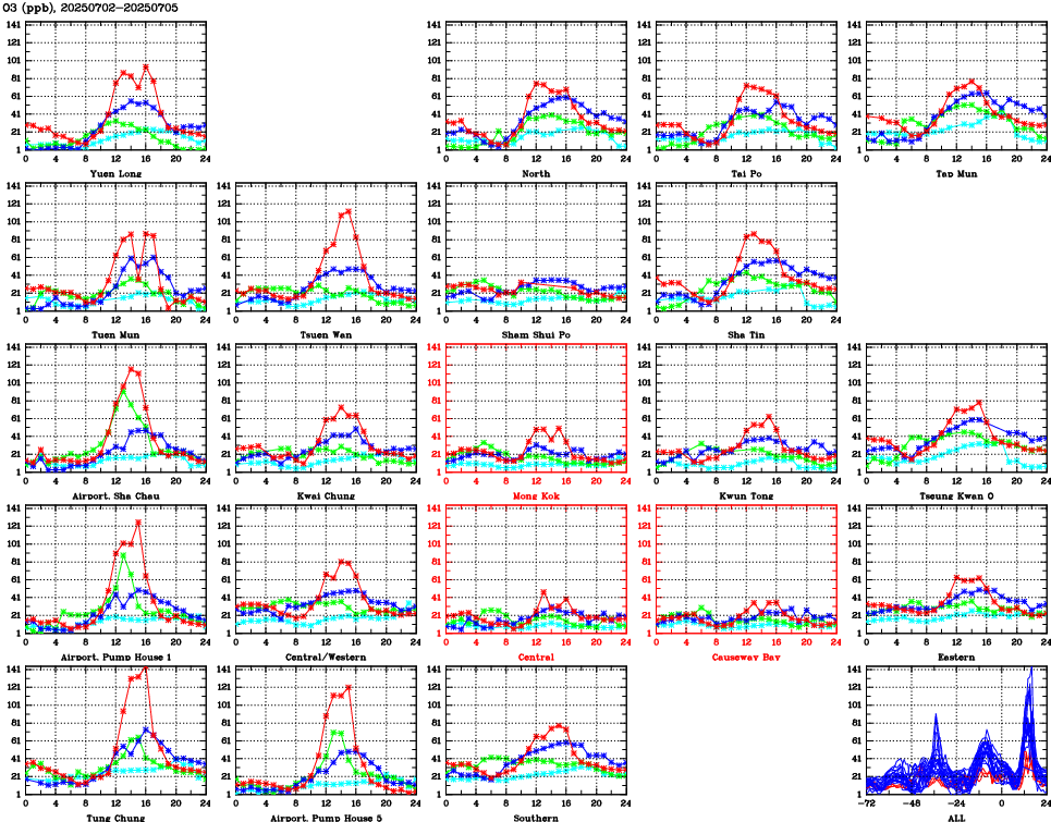 | Air Quality Data Time Series for O3 (2025/07/05) | ( Line colors: Day -3 Day -2 Day -1 Current day ) | 2D Map Current AQHI |