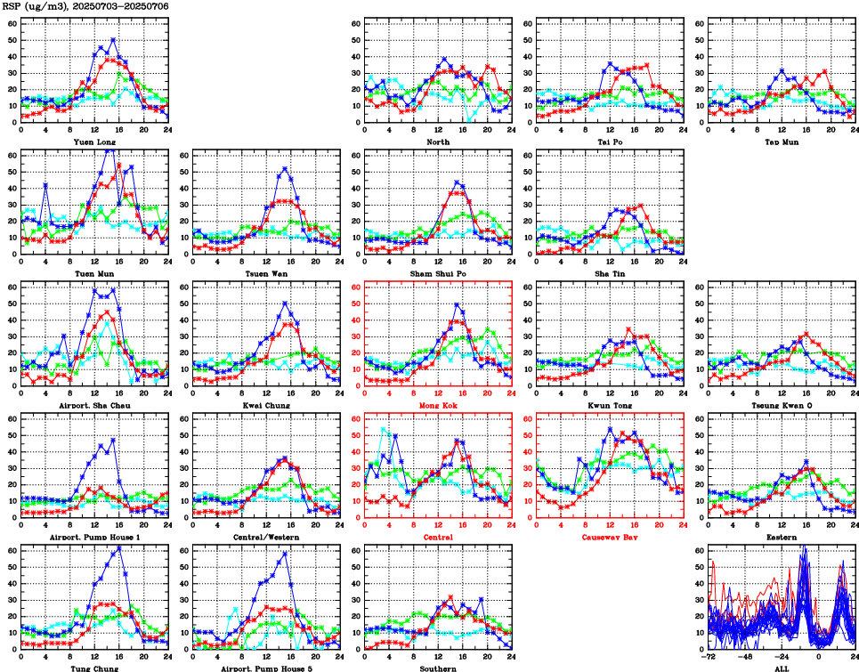 | Air Quality Data Time Series for RSP (2025/07/06) | ( Line colors: Day -3 Day -2 Day -1 Current day ) | 2D Map Current AQHI |