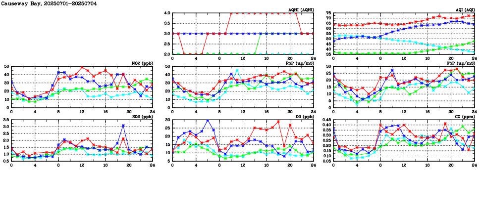 | Air Quality Data Time Series in Causeway Bay (2025/07/04) | ( Line colors: Day -3 Day -2 Day -1 Current day ) | 2D Map Current AQHI |