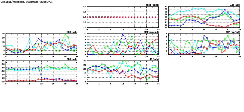 | Air Quality Data Time Series in Central/Western (2025/07/01) | ( Line colors: Day -3 Day -2 Day -1 Current day ) | 2D Map Current AQHI |