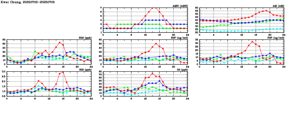 | Air Quality Data Time Series in Kwai Chung (2025/07/05) | ( Line colors: Day -3 Day -2 Day -1 Current day ) | 2D Map Current AQHI |