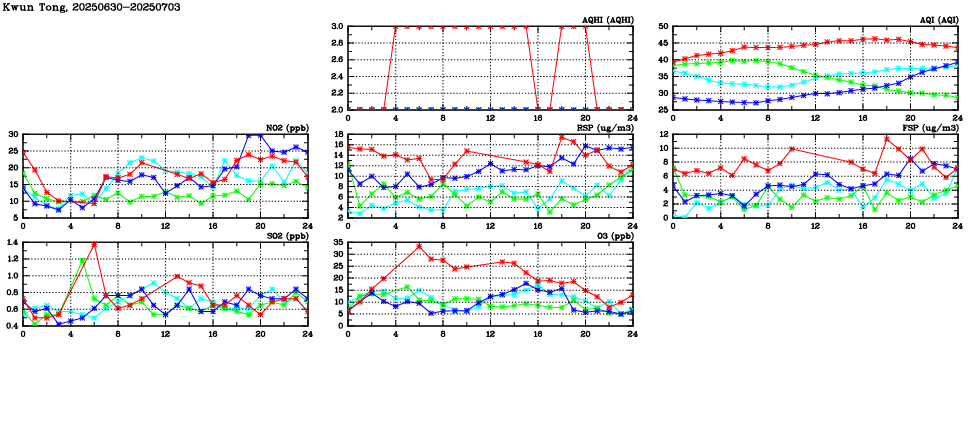| Air Quality Data Time Series in Kwun Tong (2025/07/03) | ( Line colors: Day -3 Day -2 Day -1 Current day ) | 2D Map Current AQHI |