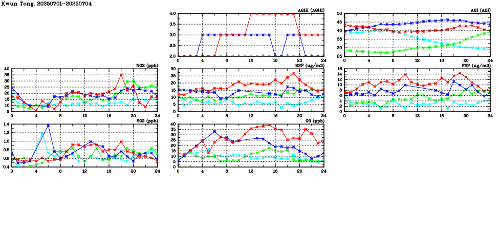 | Air Quality Data Time Series in Kwun Tong (2025/07/04) | ( Line colors: Day -3 Day -2 Day -1 Current day ) | 2D Map Current AQHI |