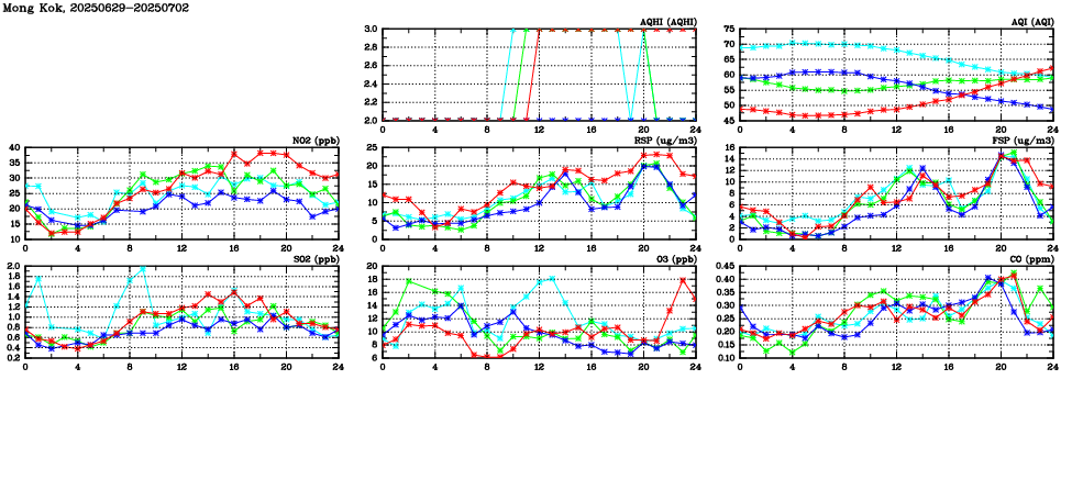 | Parameters: | AQHI | AQI | RSP | FSP | NO2 | SO2 | O3 | CO | Temp | WS | WD |
